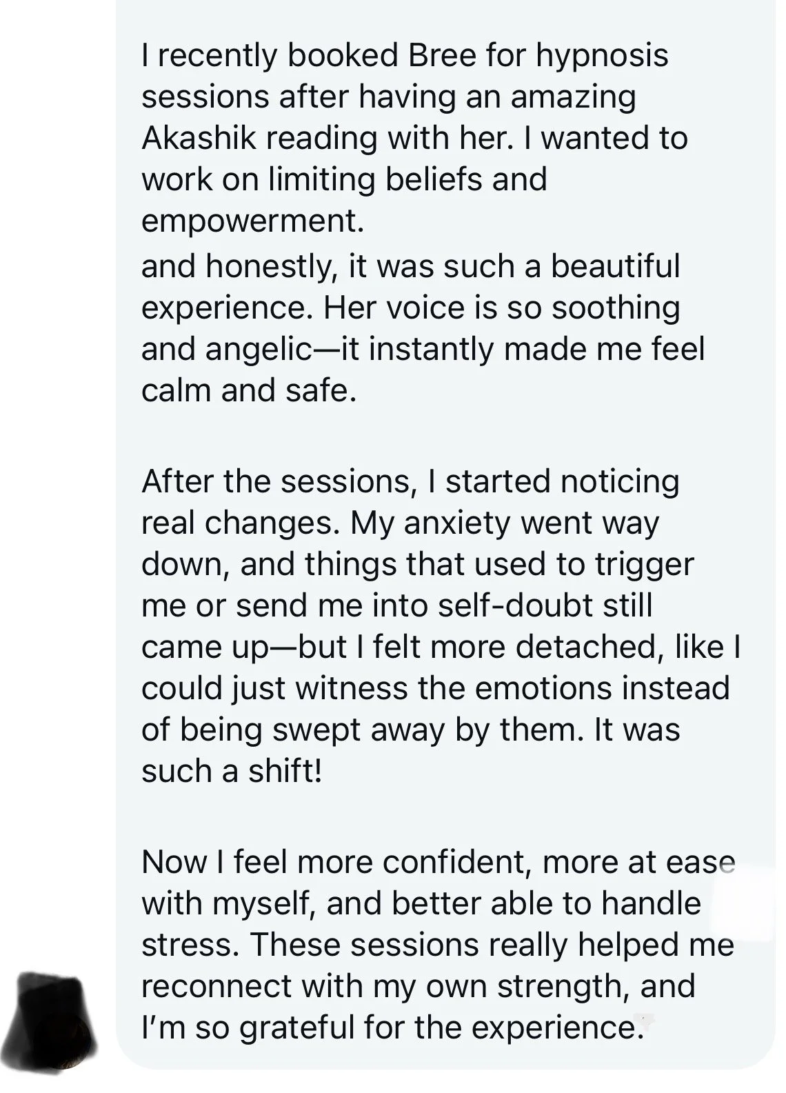 The 1:1 mentorship is created for those who are ready for deep transformation and expansion in their lives. During the 8 week mentorship Bree meets with clients once a week for 90 minute sessions utilizing the healing modalities of the Akashic Records, Quantum Energy Healing and Hypnotherapy. This mentorship are for those who are ready for accelerated healing, an expansion of opportunities, abundance and to step into their highest possible timeline.